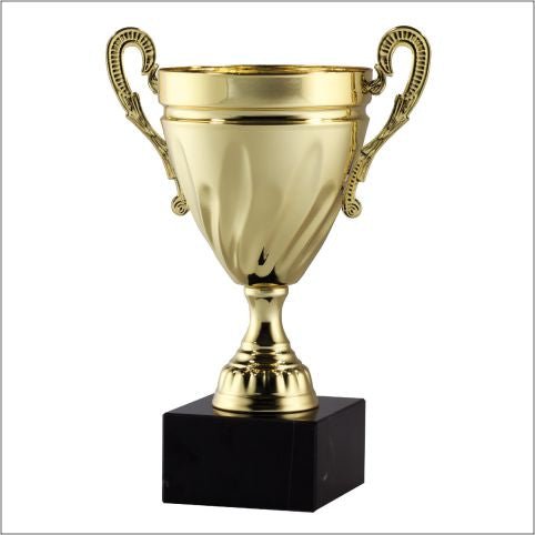 An Elegant Gold Metal Cup On Gold Pedestal And Genuine Black Marble Base