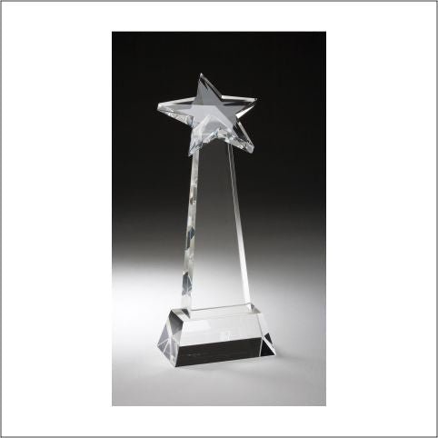 An Elegant Tall Shooting Star Crystal Award With Matching Clear Crystal Base, Fully Laser And Rotary Engravable And Includes A Deluxe Velour Lined Presentation Box