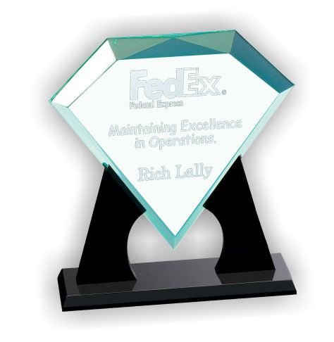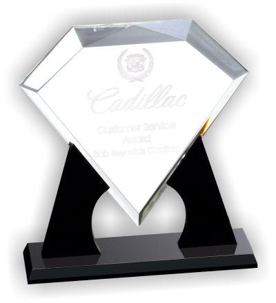 A Clear Diamond Acrylic Award On Black Acrylic Pedestal. Fully Laser And Rotary Engravable With Satin Lined Presentation Box