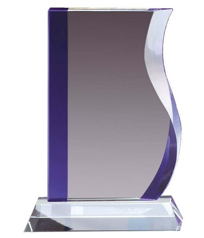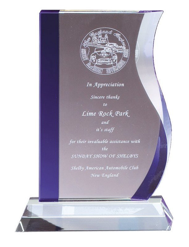 An Elegant Clear And Blue Crystal Award With Matching Clear Crystal Base, Fully Laser And Rotary Engravable. Includes Deluxe Velour Lined Presentation Box