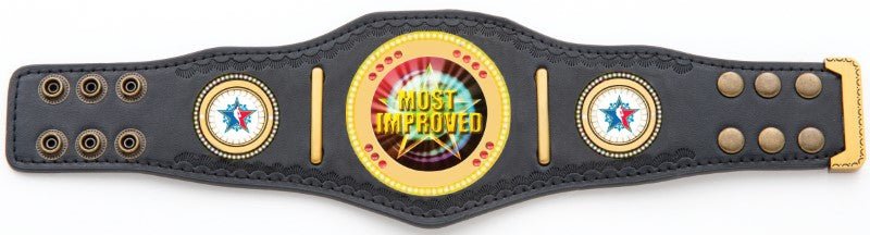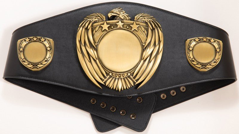 Durable and elegant Black and Gold Wrestling Championship Belt with heavy duty die cast mounts, metal snaps and presentation bag