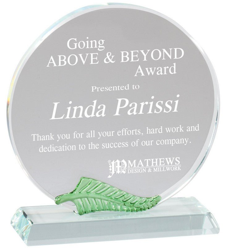 Unique Circle Crystal award with color leaf trim, laserable with gift box