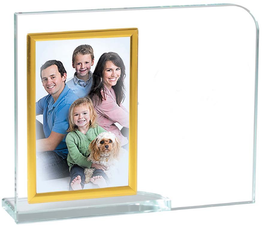 Clear glass award that holds a 3 1/2″ x 5″ photo and laserable