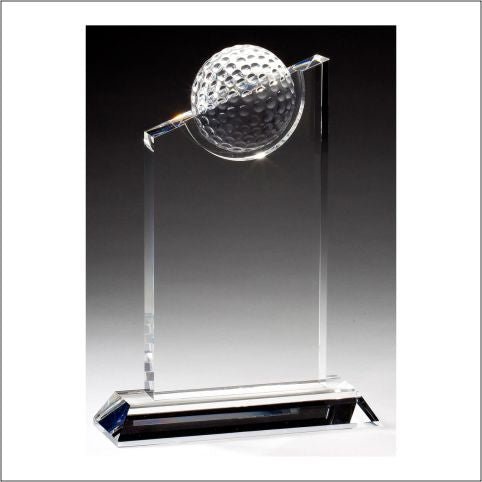 An Elegant Tall Crystal Award With 3-D Fully Dimpled Golf Ball And Fully Laser And Rotary Engravable. Includes A Deluxe Velour Lined Presentation Box