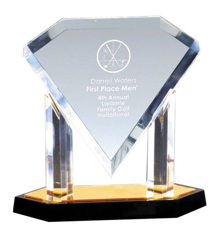 An Acrylic Diamond Plaque On Blue Reflective Pedestal Base. Fully Laser And Rotary Engravable