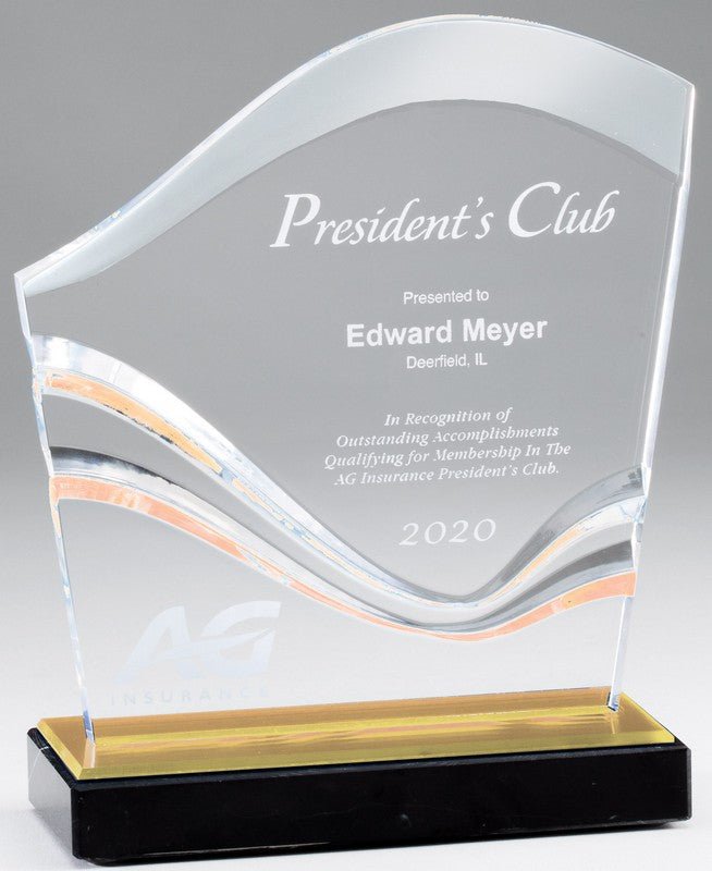 Elegant Clear / Gold Wave Acrylic Award On Black Marble Base Laserable 6 Std Pack 6 3/4″ X 6 3/4″