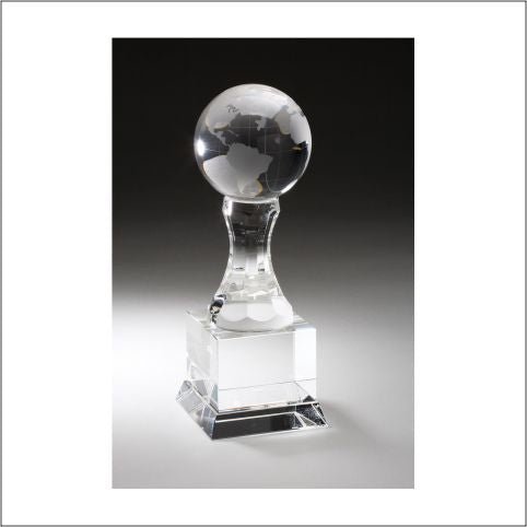 A Statuesque Frosted World Globe Crystal Award With Clear Crystal Tall Base And Fully Laser And Rotary Engravable With Deluxe Velour Lined Presentation Box