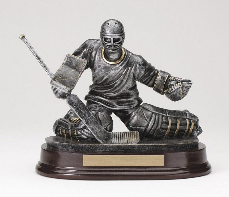 An Elegant Pewter And Gold Ice Hockey Goalie Sport Award On Dark Finish Base With Room For An Engraving Plate With Room For An Engraving Plate