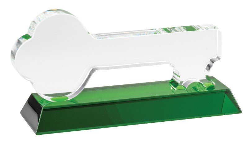 This Optical Crystal Key is 9″ wide and sits on a green crystal base. It comes in a presentation box.