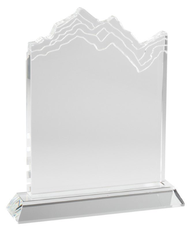 This elegant Optical Crystal features a Mountain Peak top and sits on a rectangle crystal base. It comes in a presentation box.