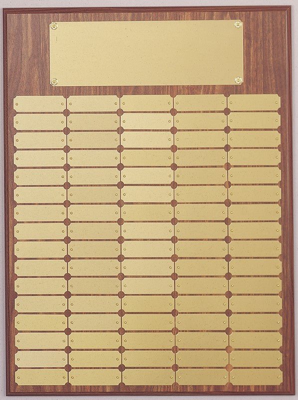 An Elegant Walnut Finish Perpetual Plaque With Satin Gold Header And 80 Matching Individual Plates