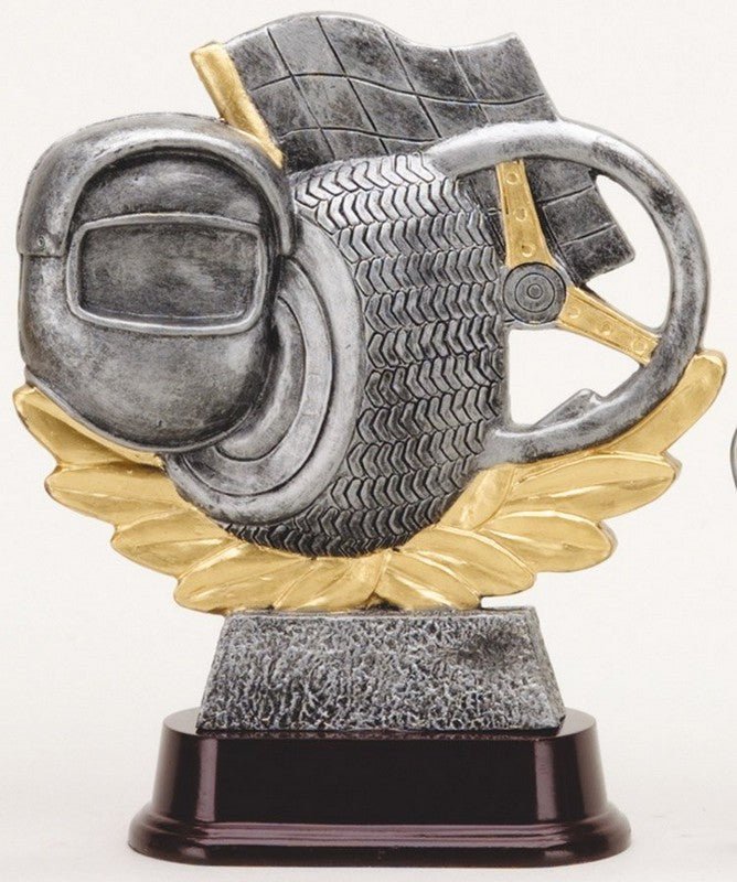 Premium Sculpted Resin Antique Gold Racing Helmet, Wheel Tires And Checkered Flag On Wood Finish Base