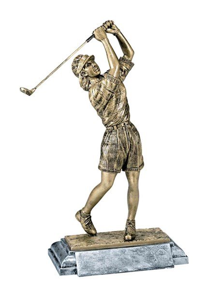 Classic Sculpted Golf Female Resin Figure in Full Swing on Plated Resin Base