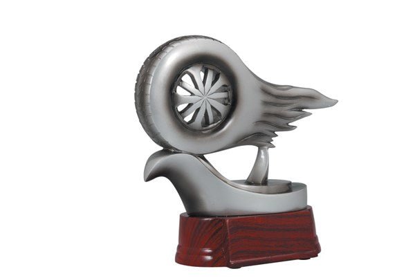 Classic Sculpted Racing Wheel Rresin Figure on Rosewood Finish Base