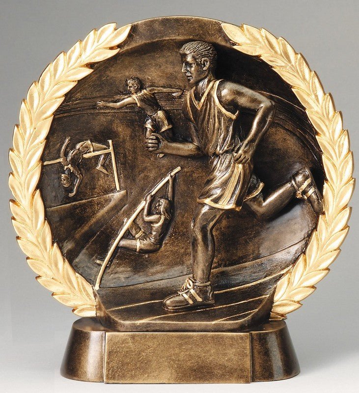 An Elegant High Relief Resin Track, Male Sport Award On An Antique Bronze Finish With Gold Finish Border