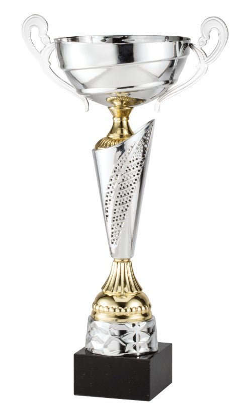 This elegant silver cup with gold accents features a metal cup and plastic stem, mounted on a genuine marble base. It is available in three sizes.