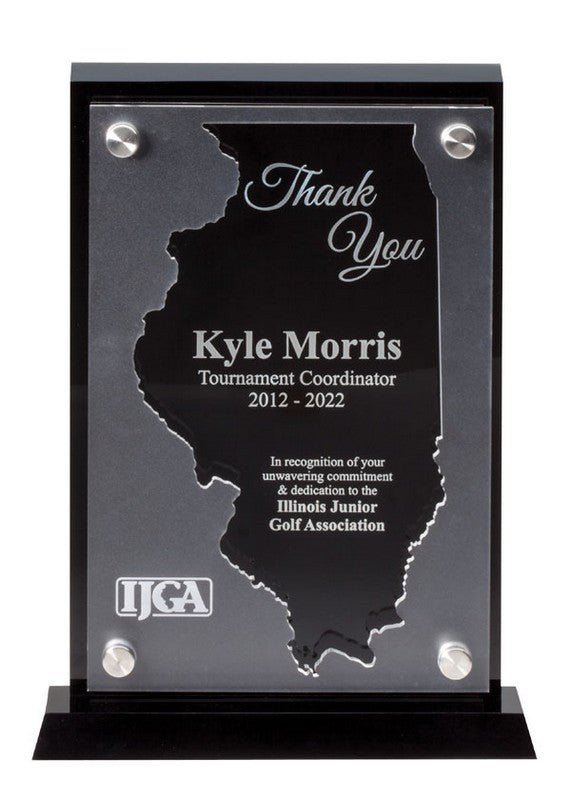 Elegant Black Acrylic Award With A Black Aluminum Engraving Plate That Lasers Silver And A Floating 1/4″ Frosted Acrylic Plated Mounted With Satin Silver Stand Offs With Laser Cut State Outline Providing A Dynamic 3d Appearance