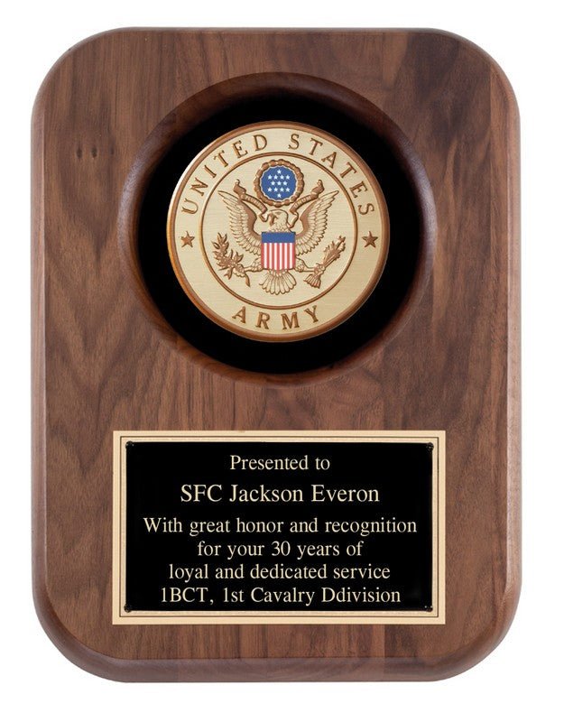 Elegant Walnut Army Plaque with radius corners, full color Insignia , black and gold engraving plate and individually boxed